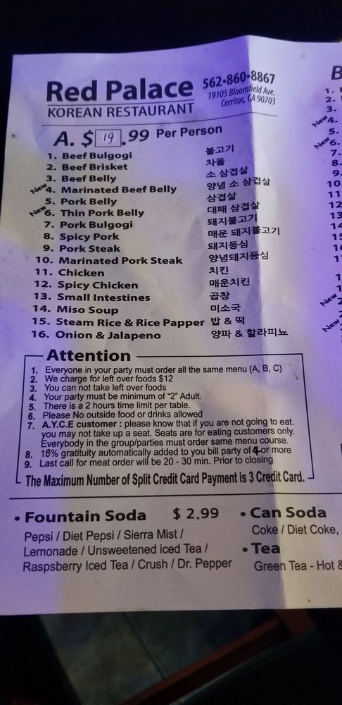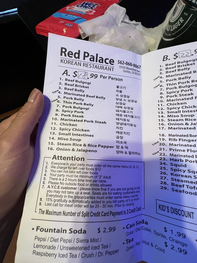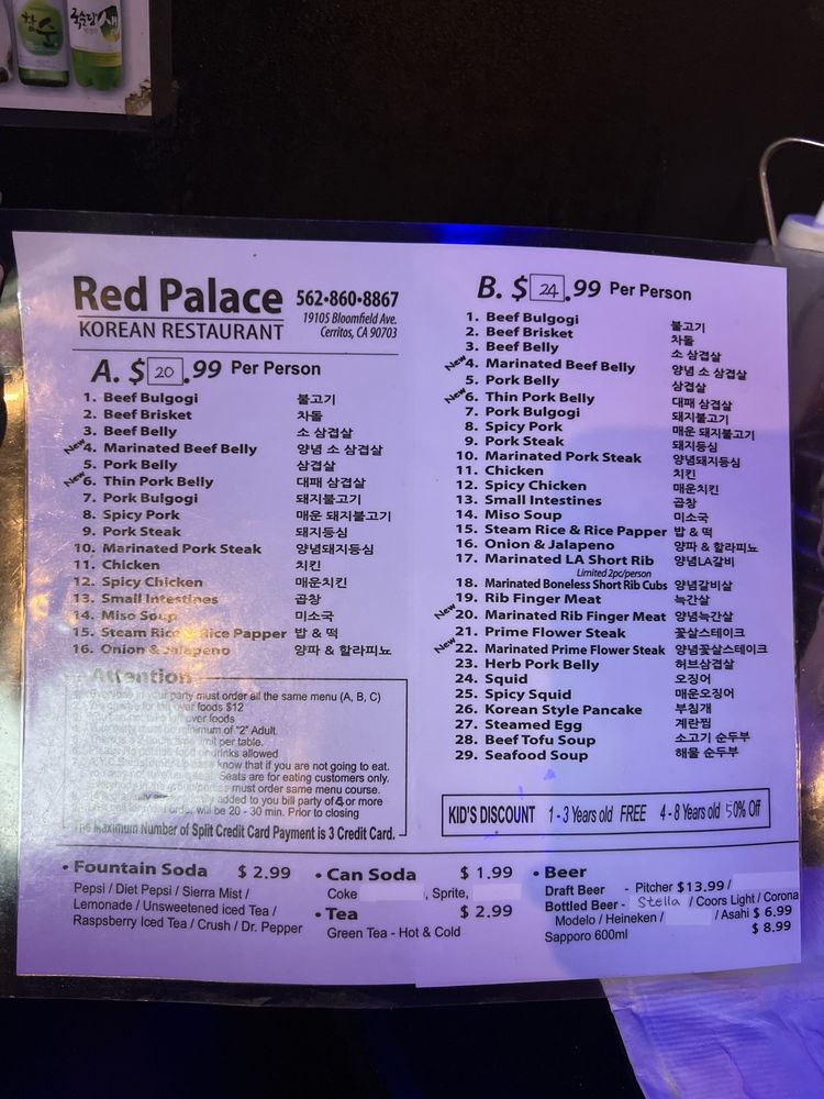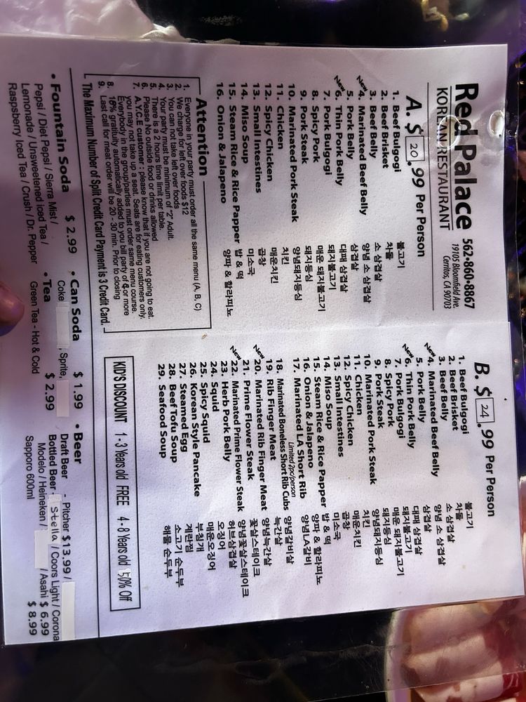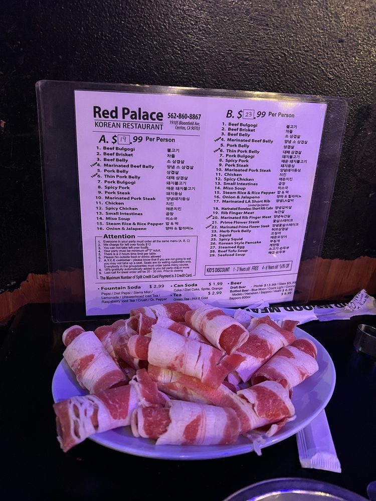 Red Palace, located in Cerritos, CA, offers a diverse menu with a focus on meat selections such as bulgogi, pork belly, roast, chicken, kalbi, and intestine. The restaurant provides a casual and lively atmosphere, making it suitable for groups and families. Customers praise the excellent service and the delicious meats that are served promptly. Alongside the meat options, Red Palace also offers a variety of banchan and complementary sides, enhancing the dining experience. The restaurant's ambiance is reminiscent of Korea, contributing to a unique and enjoyable dining experience. With a good selection of beer and soju, Red Palace is a popular choice for those looking to indulge in Korean BBQ. The friendly staff, quick service, and high-quality meat make it a must-visit spot for meat lovers in the area.
