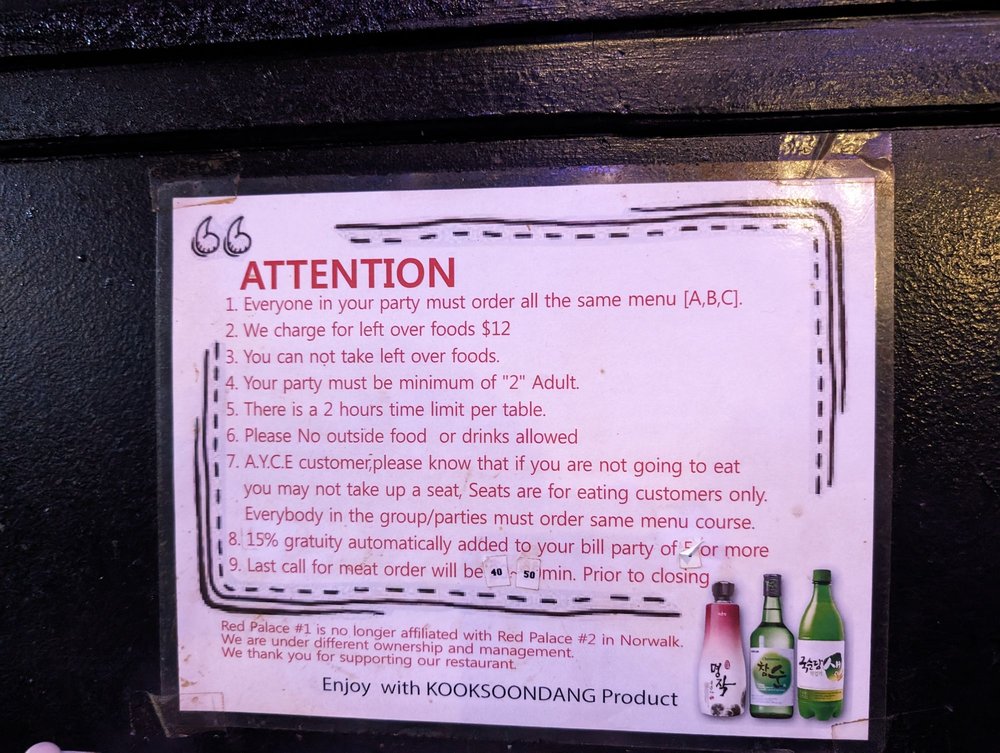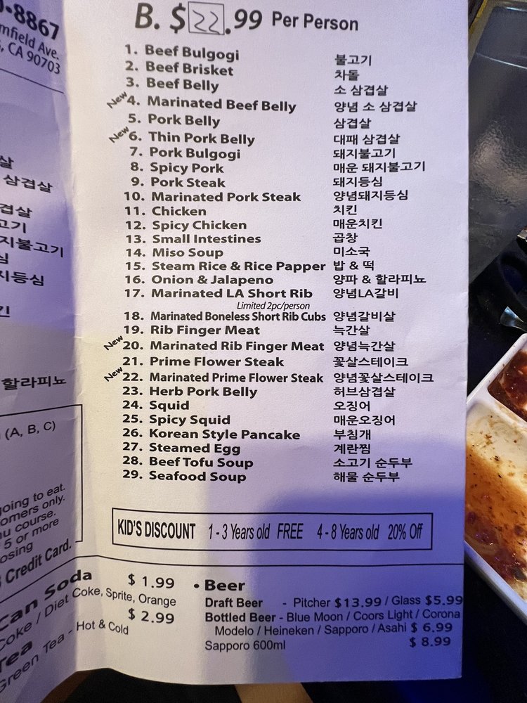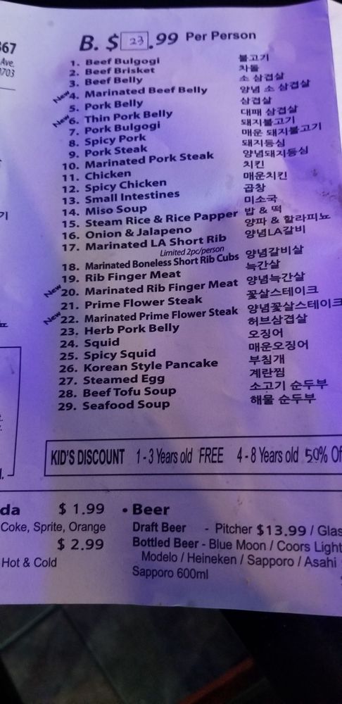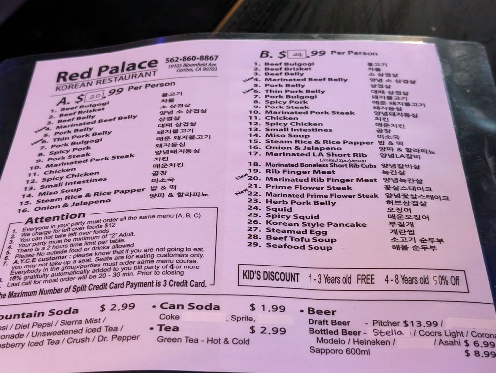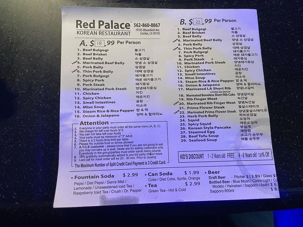 Red Palace, located in Cerritos, CA, offers a diverse menu with a focus on meat selections such as bulgogi, pork belly, roast, chicken, kalbi, and intestine. The restaurant provides a casual and lively atmosphere, making it suitable for groups and families. Customers praise the excellent service and the delicious meats that are served promptly. Alongside the meat options, Red Palace also offers a variety of banchan and complementary sides, enhancing the dining experience. The restaurant's ambiance is reminiscent of Korea, contributing to a unique and enjoyable dining experience. With a good selection of beer and soju, Red Palace is a popular choice for those looking to indulge in Korean BBQ. The friendly staff, quick service, and high-quality meat make it a must-visit spot for meat lovers in the area.